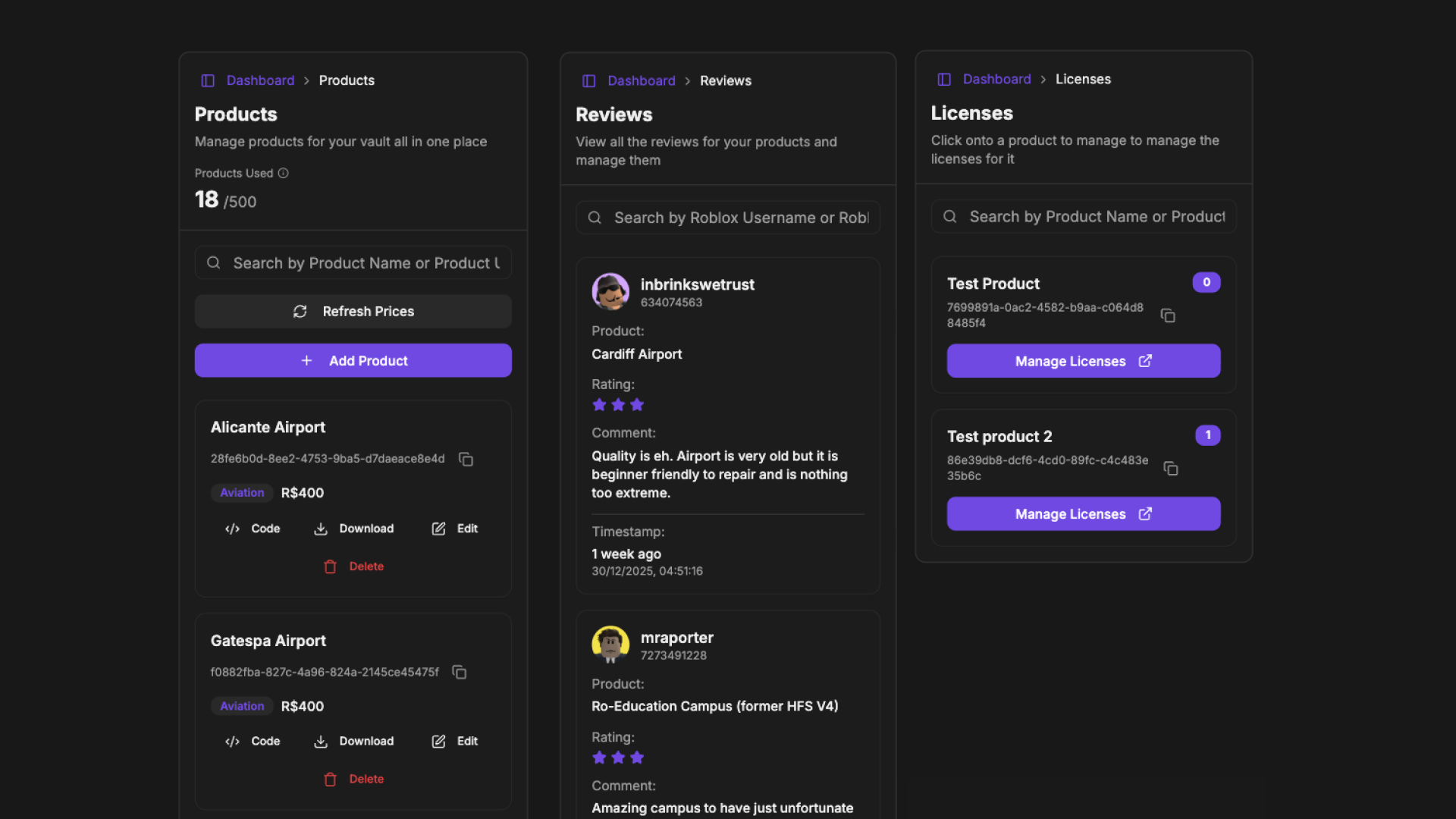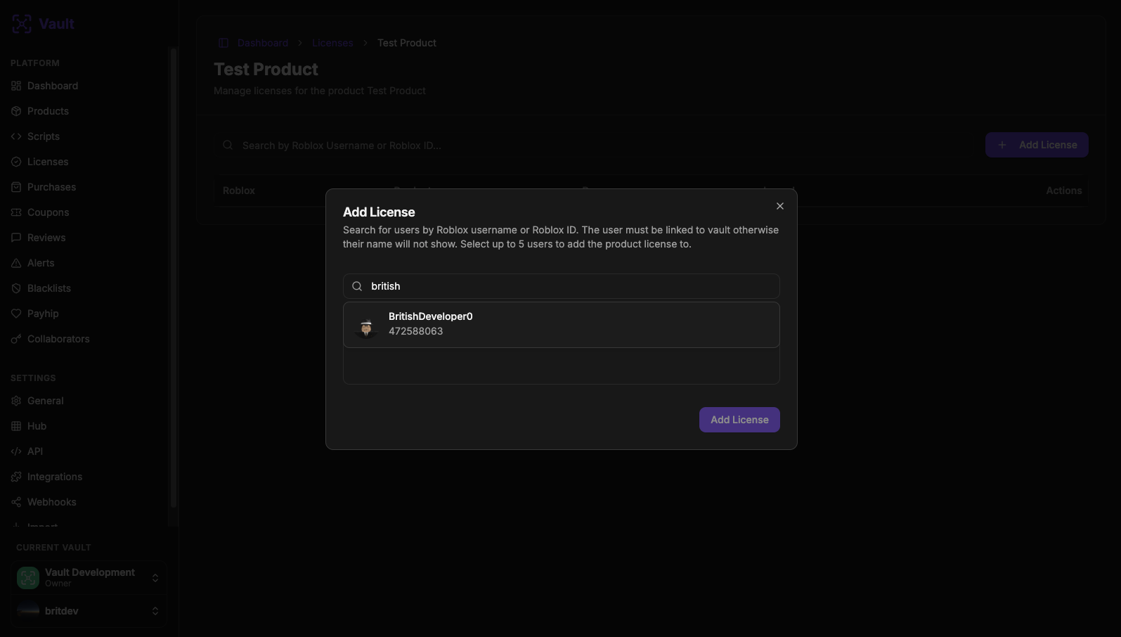 We have added the ability to search for linked Roblox accounts that use vault to transfer and add licenses. This is easier than needing to find the Roblox ID for the person you want to transfer or add the license.