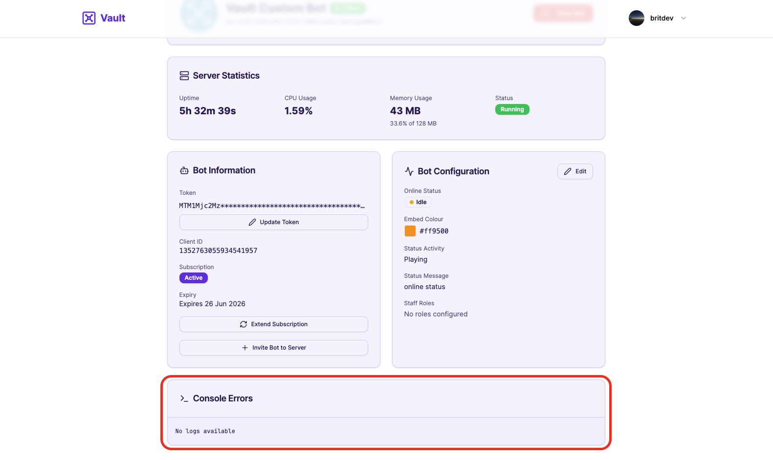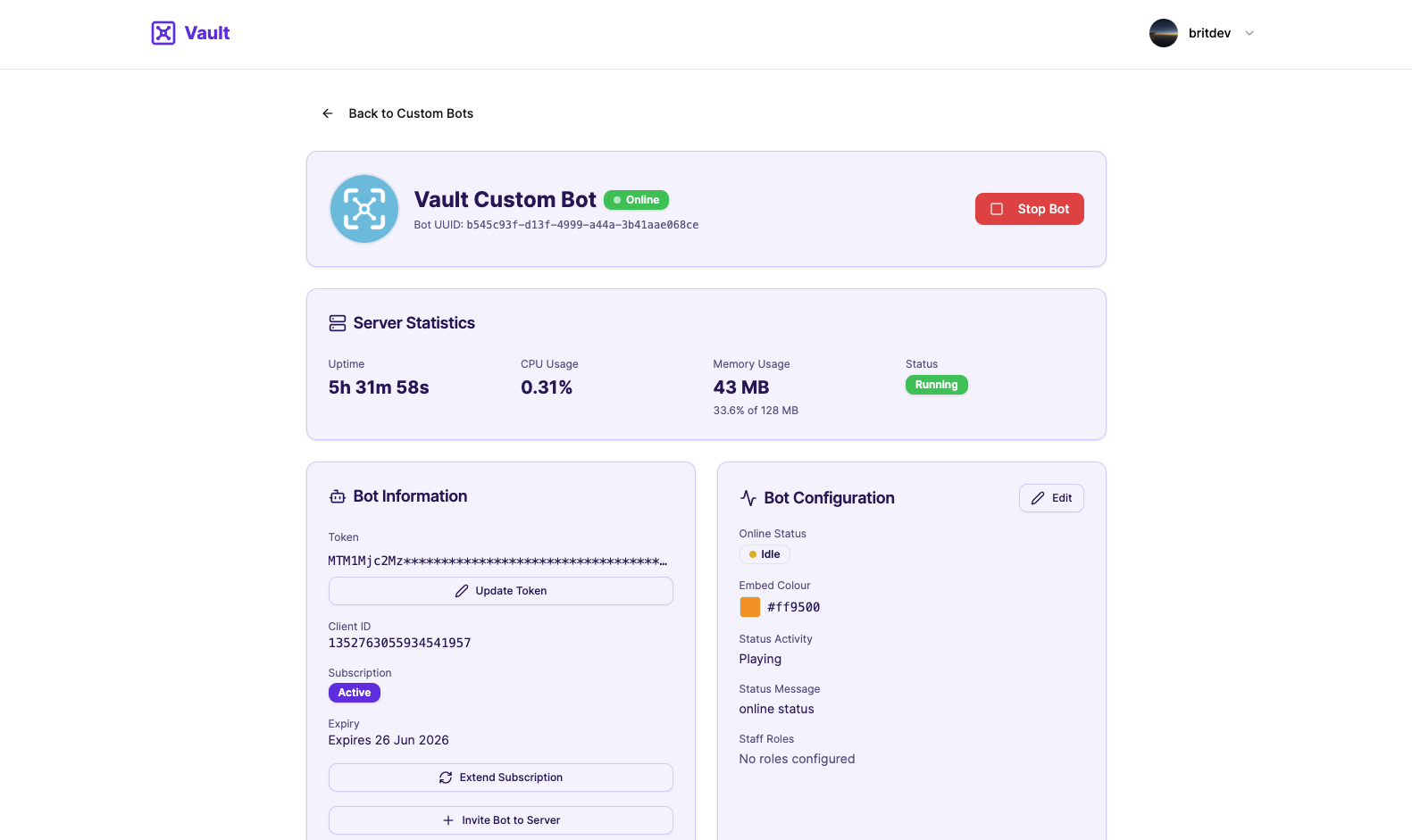 Managing your custom bot is simple from now on as we handle all the technical details of keeping the bot up to date with updates and security issues. We give you your own dashboard which you can manage details such as the customisation options, staff roles and the bot token. A screenshot is attached below of what your custom bot dashboard will look like.